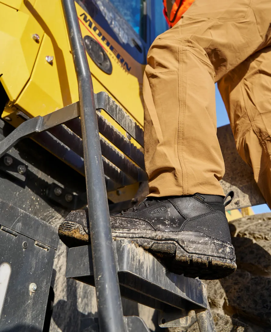 Protects like a work boot and feels like a sneaker. This versatile, waterproof men’s 6″ style features a tough leather upper and energy-returning cushioning.Best For: Warehouse | Framing | Carpentry | Construction | Electrician | Landscaping